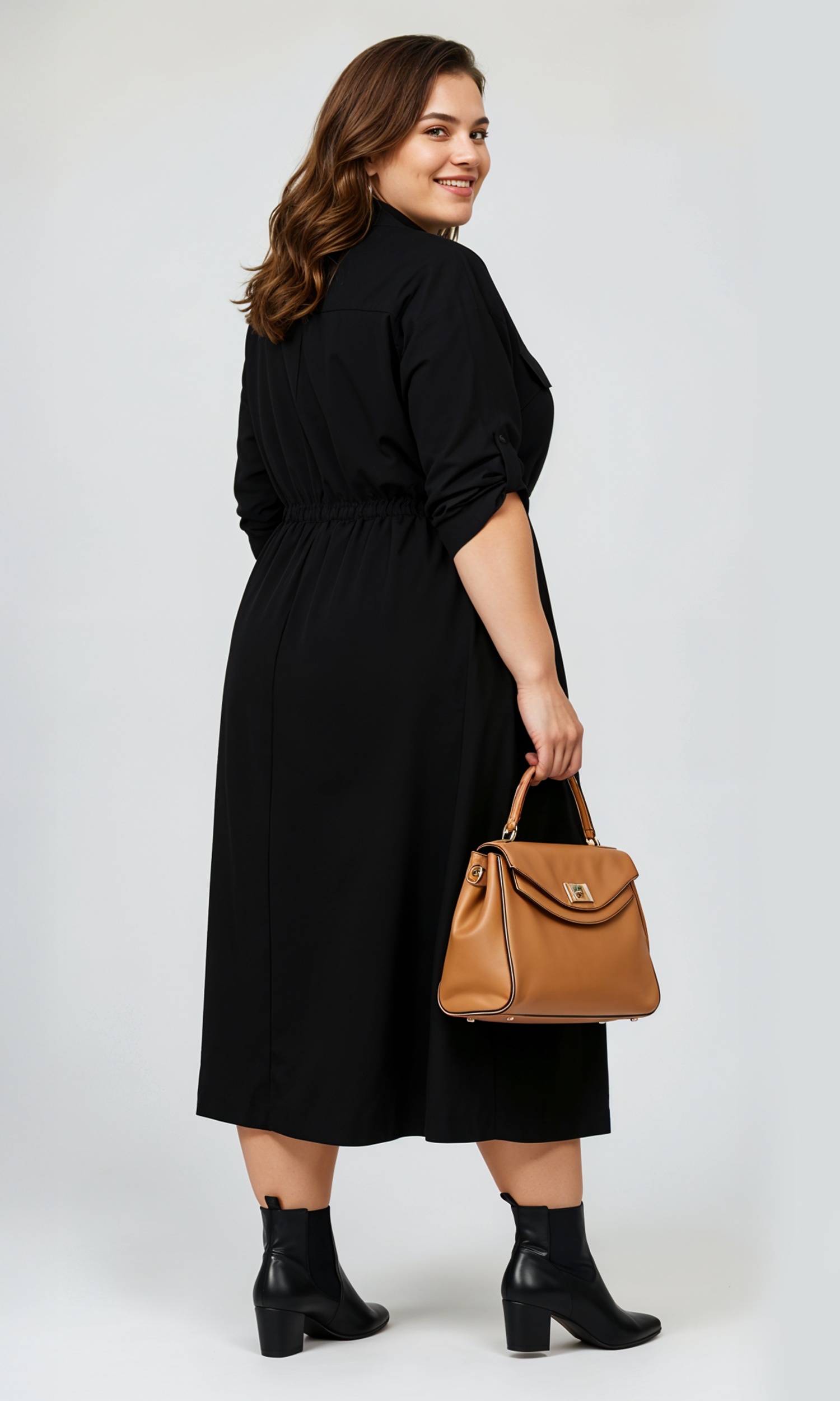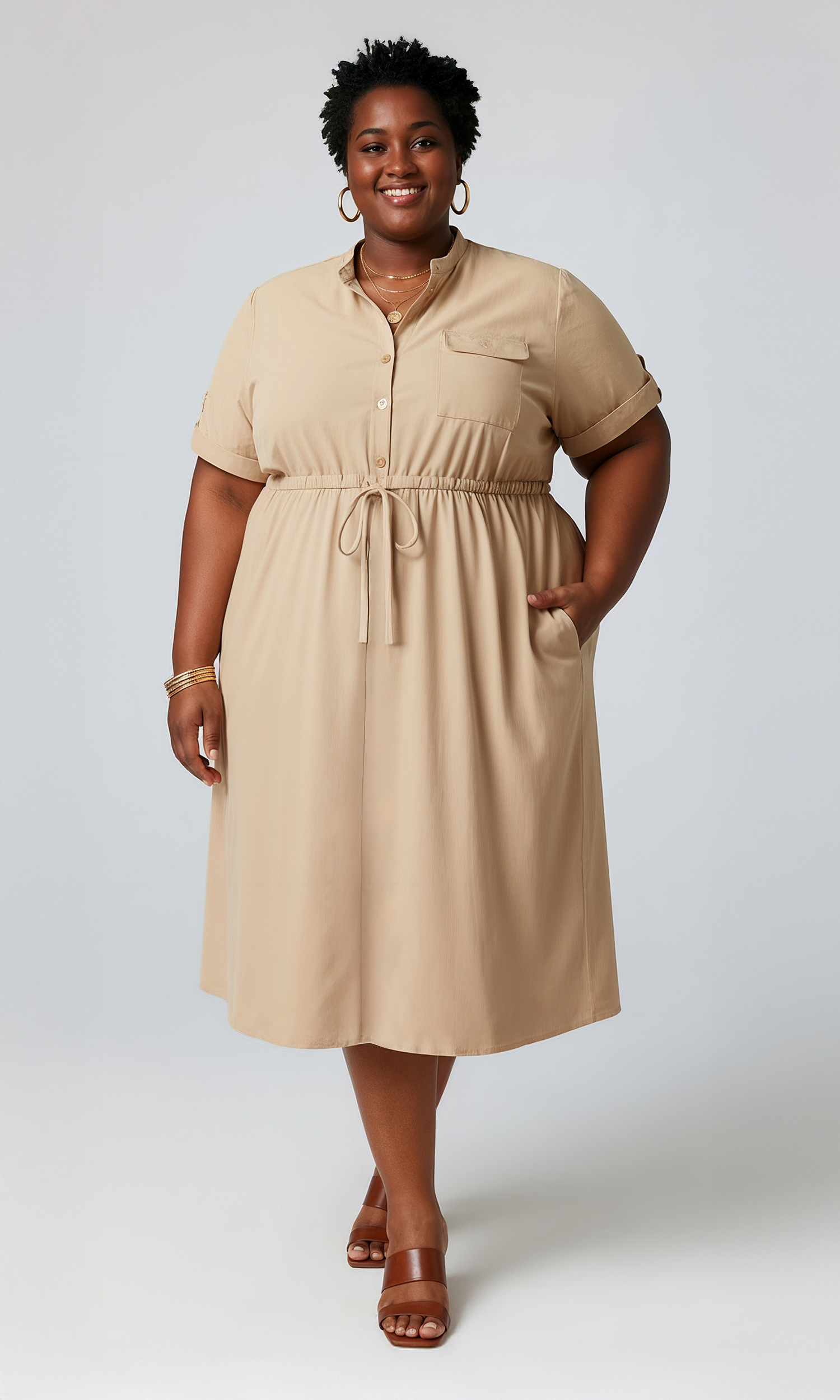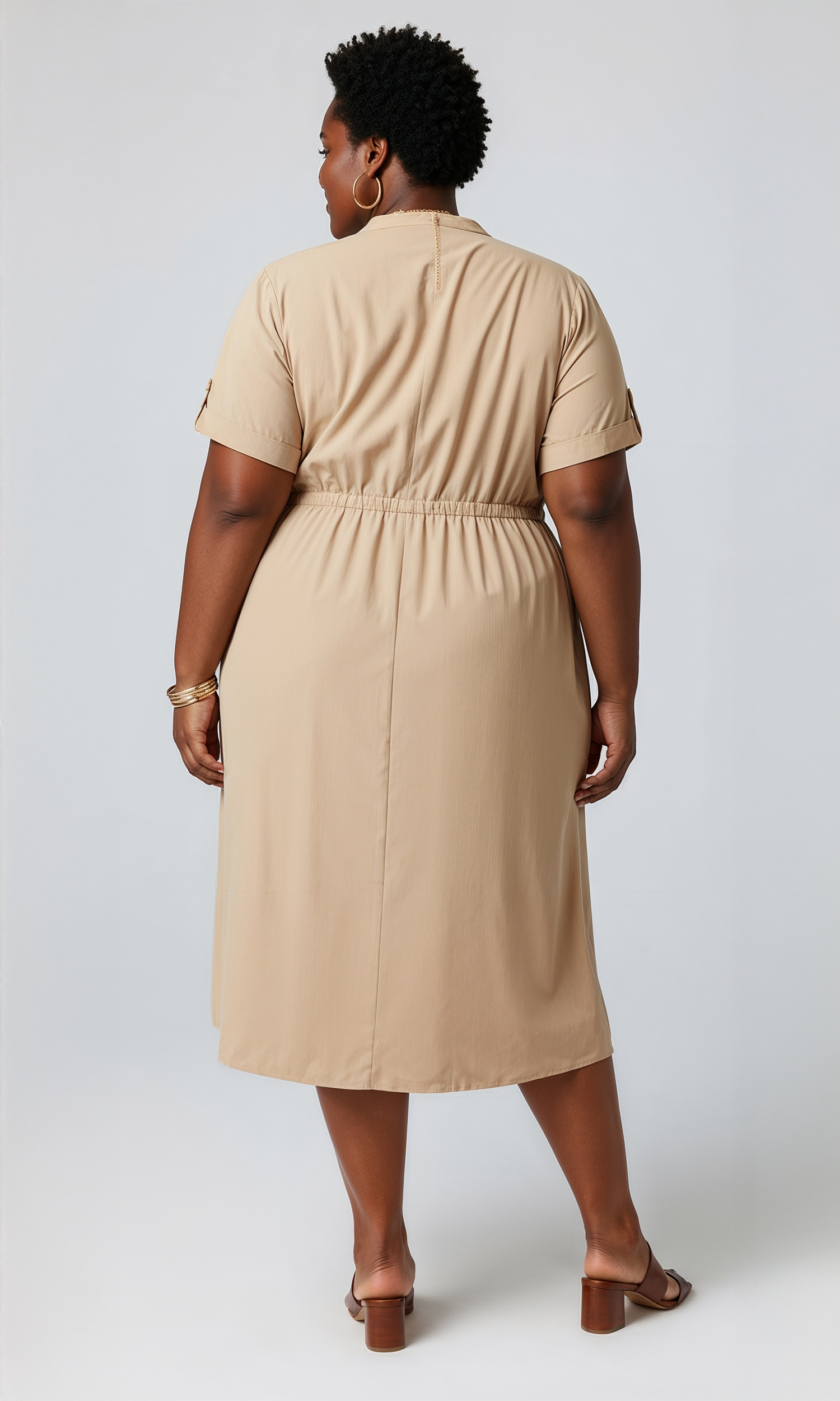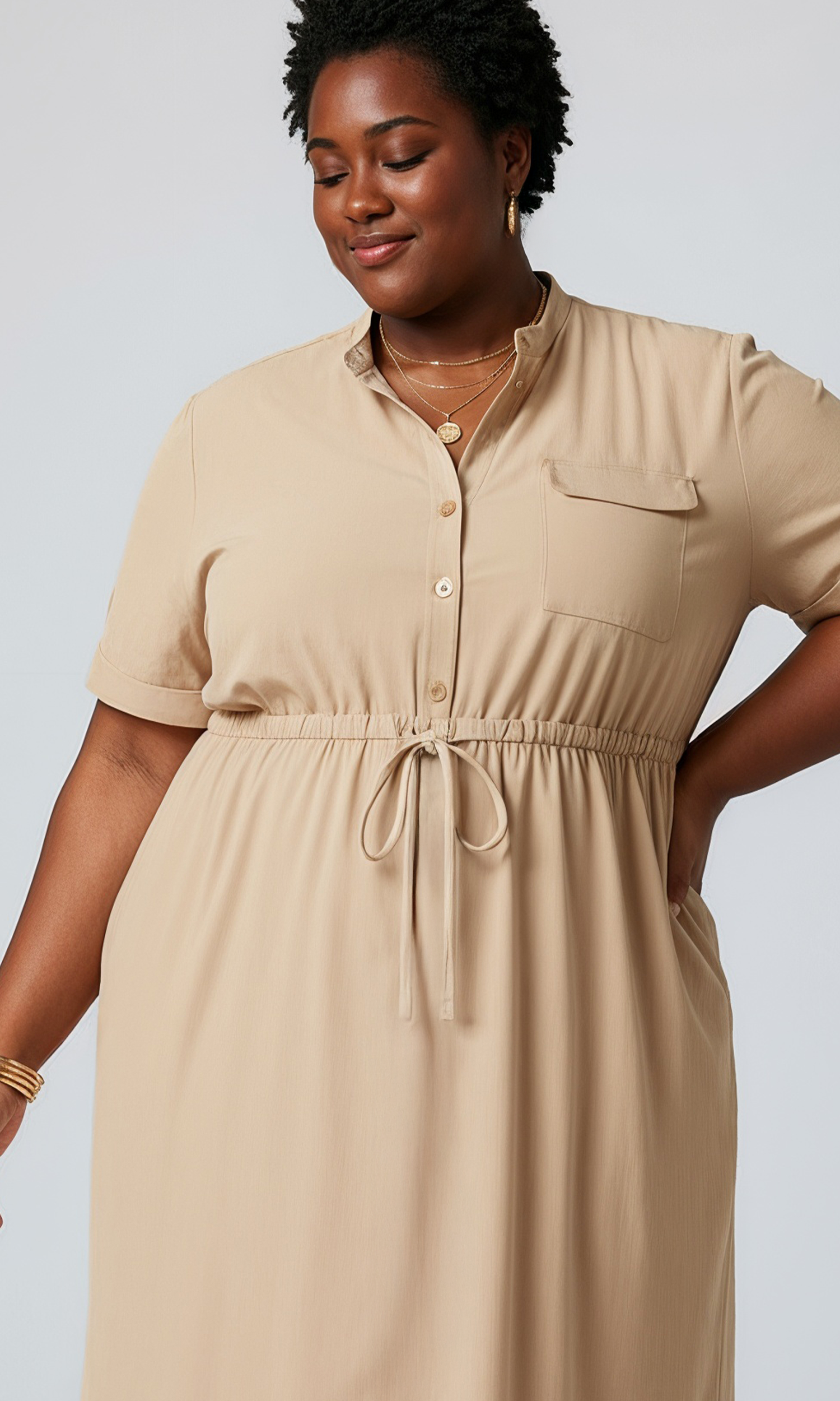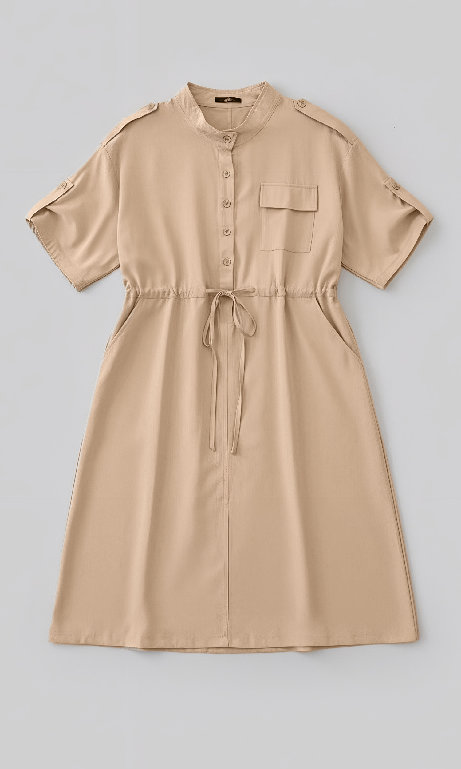 This dress is crafted from smooth, breathable cotton with a light stretch that moves with you throughout the day. The soft, skin-friendly fabric feels weightless on the body and gives a relaxed, confident fit, easy, flattering, and never clingy.