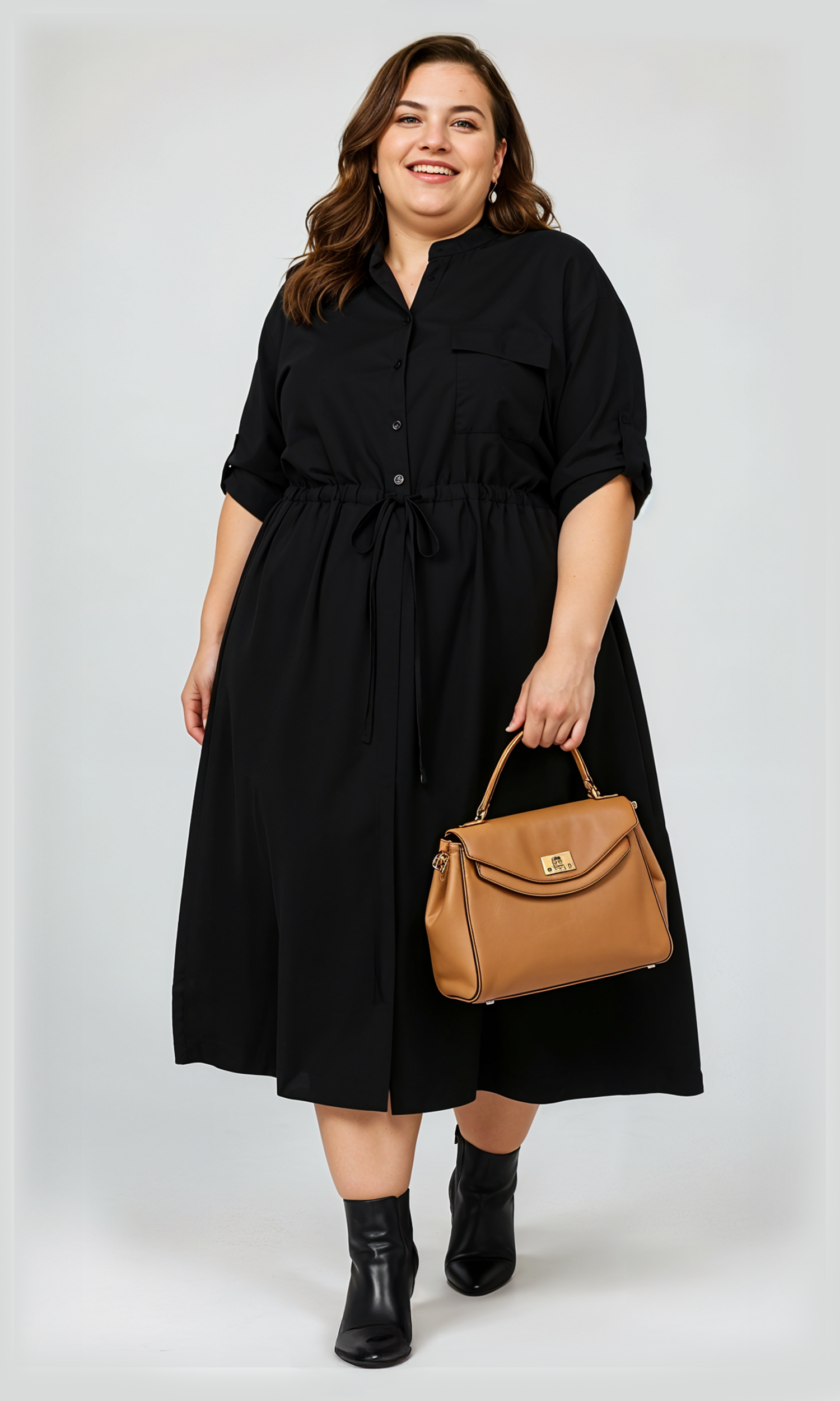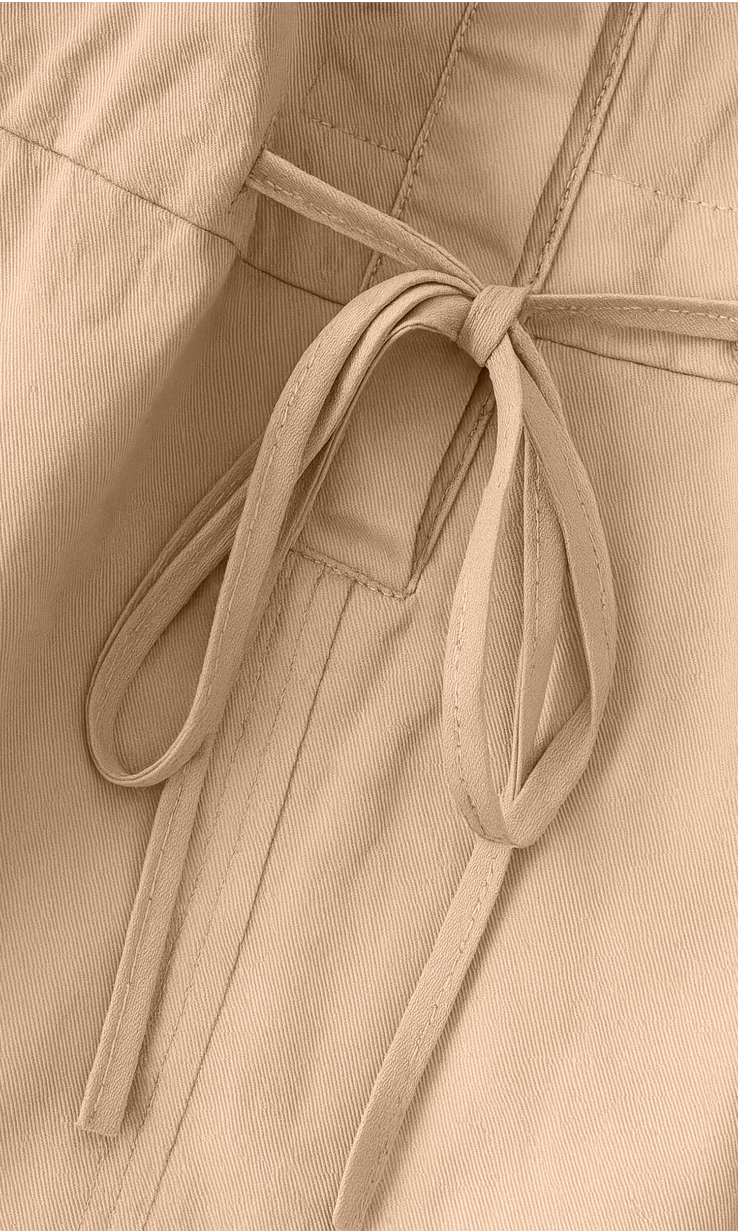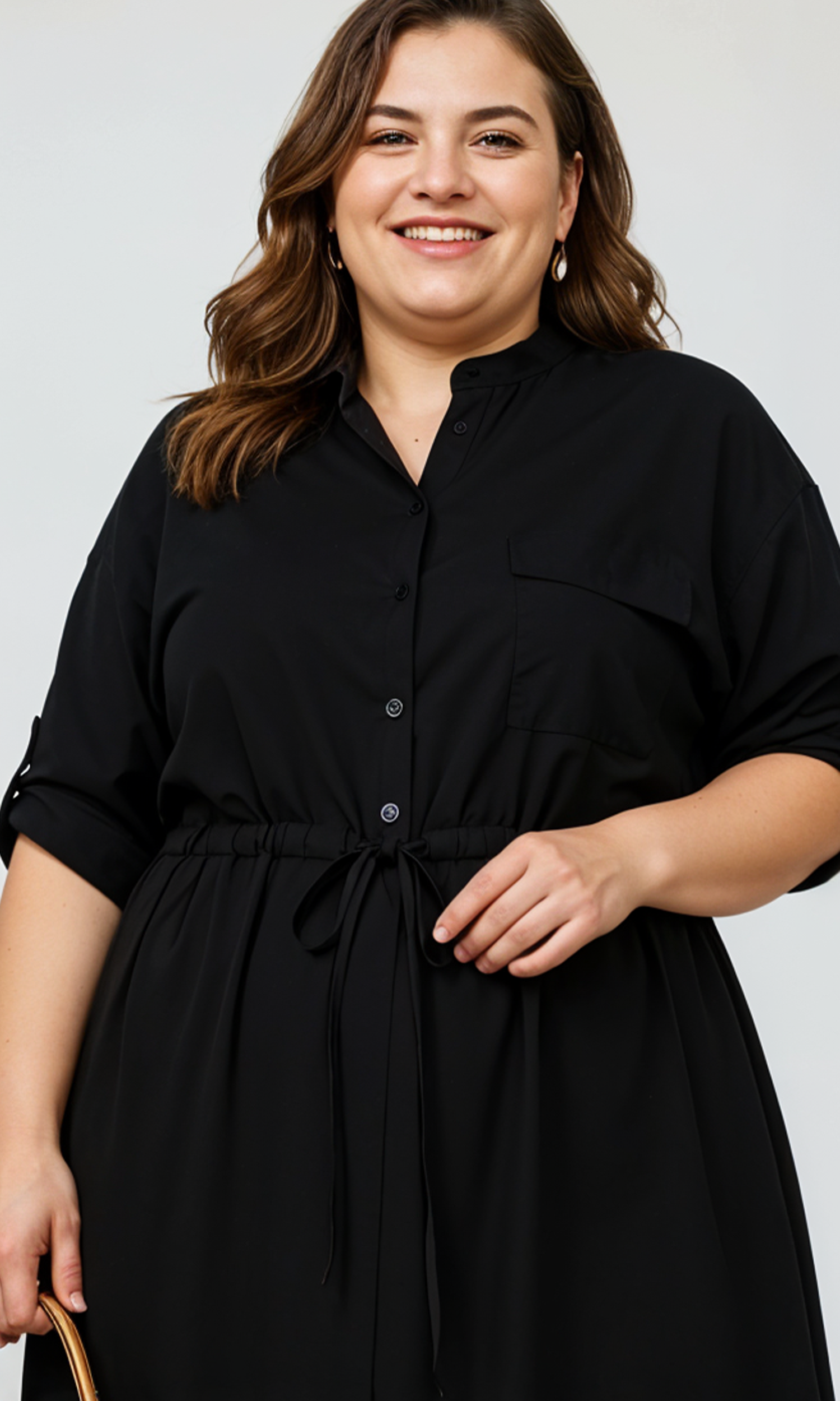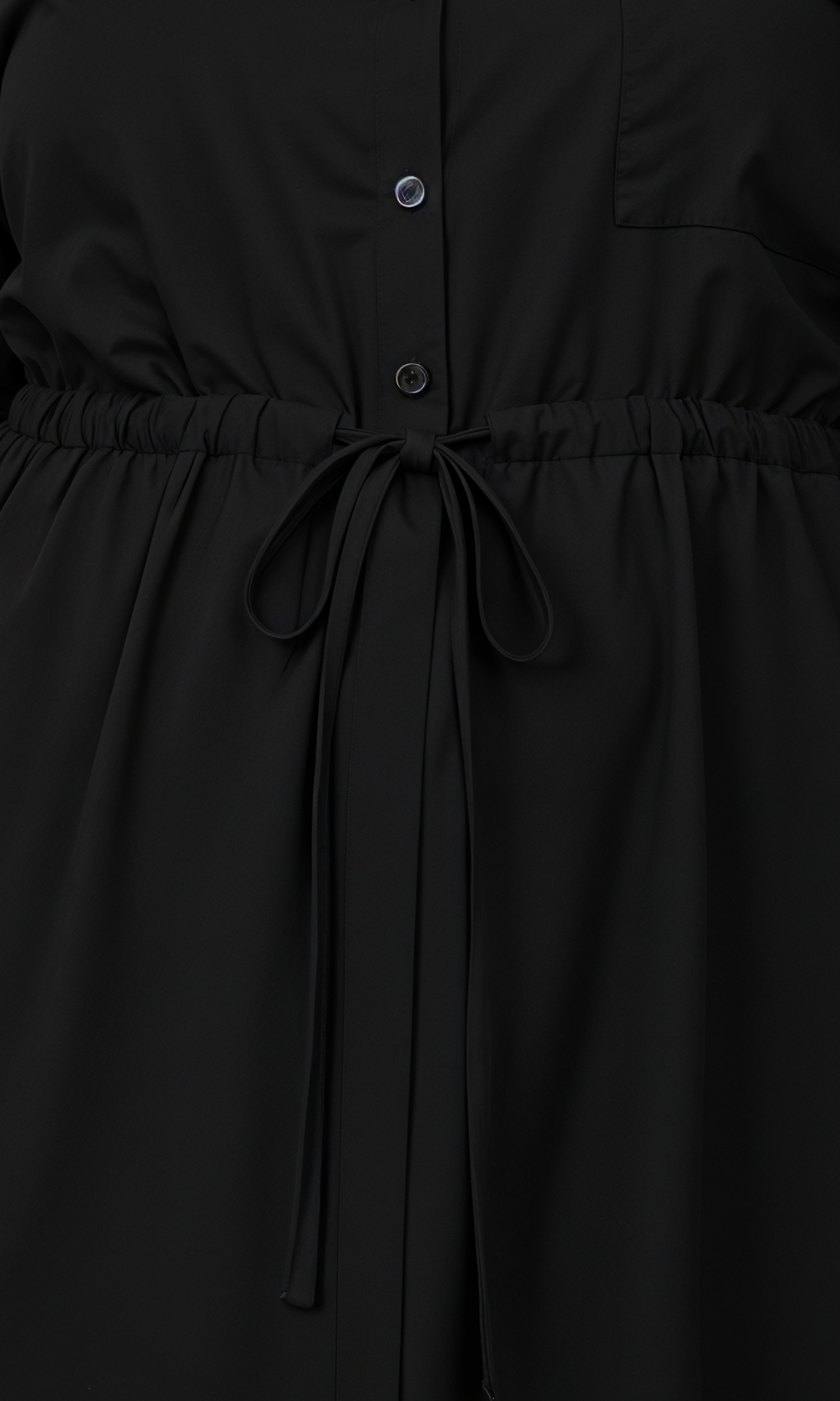 Designed with a loose silhouette that gives gentle room around the tummy, hips, and arms, it lets you breathe and move freely without feeling restricted. The adjustable waist tie defines your shape just the way you like it, while the button-front design and cuffed sleeves add a timeless, easygoing touch.