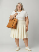 The mid-calf length gives a balanced, flattering line that elongates your silhouette, while the soft pleats fall beautifully over your tummy and hips. The high, empire-style waistband creates a comfortable fit that smooths rather than squeezes, bringing an easy sense of confidence to your every step.