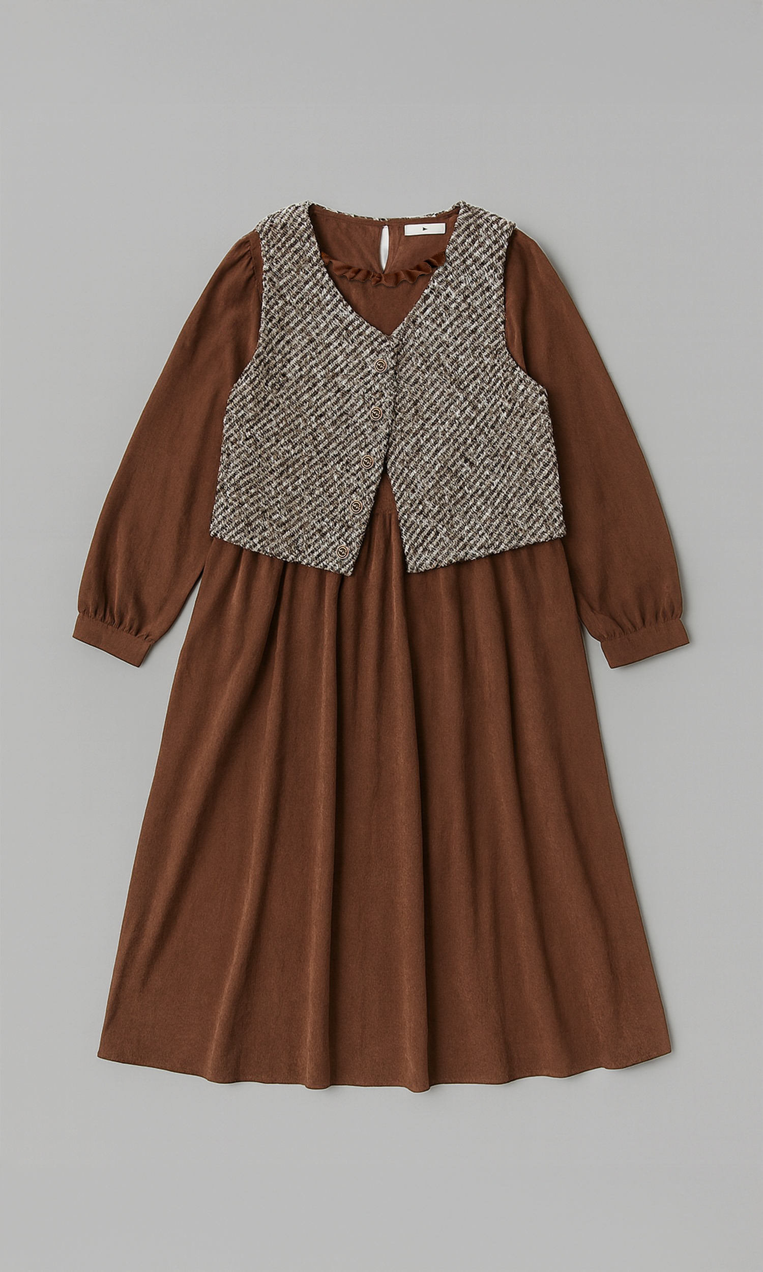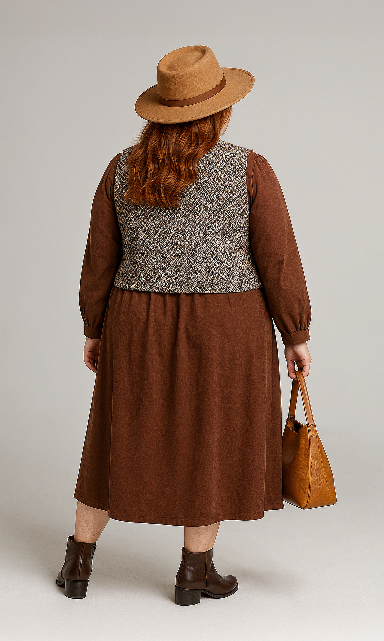 This soft brown midi dress with a textured tweed vest brings warmth, comfort, and timeless charm together in one easy outfit.