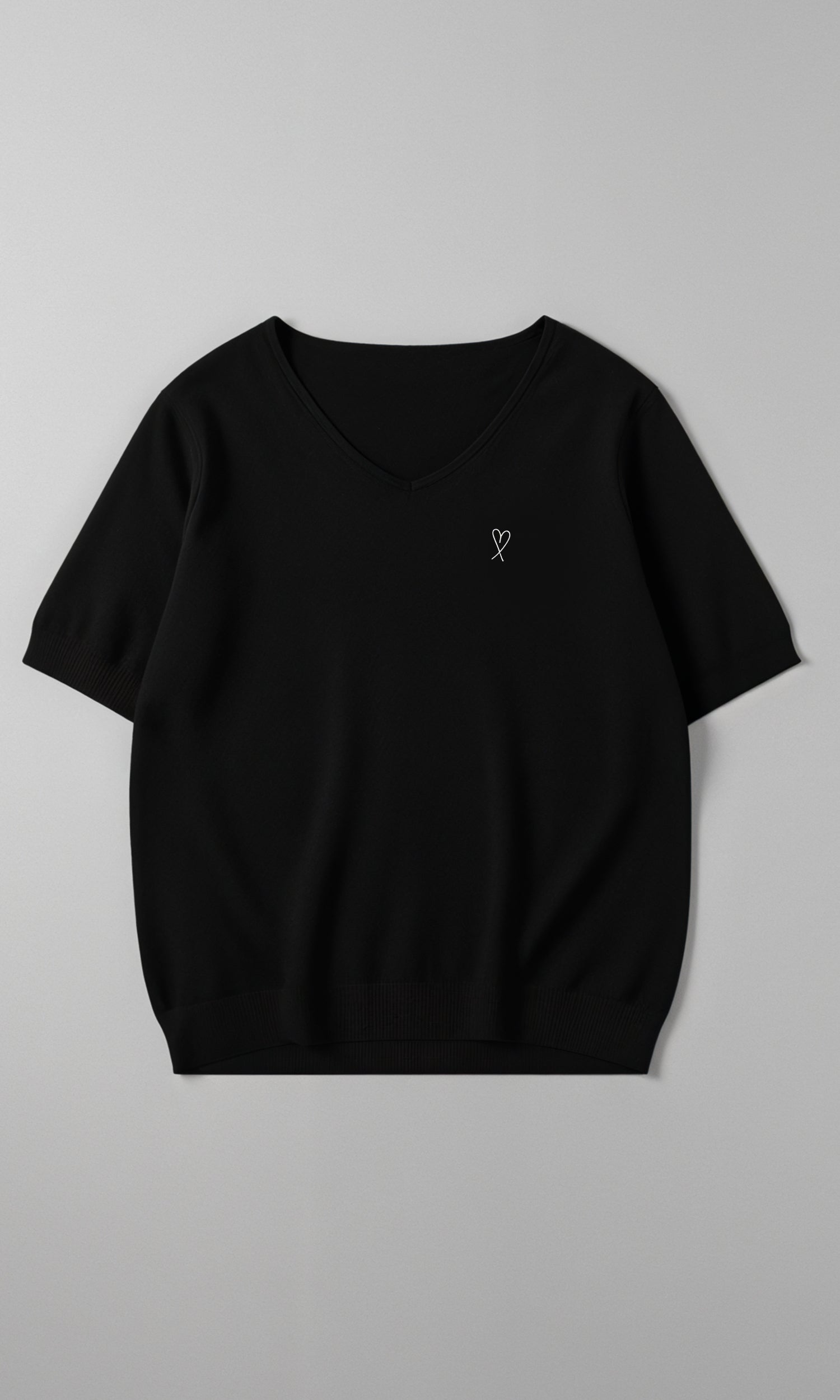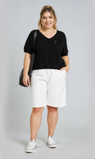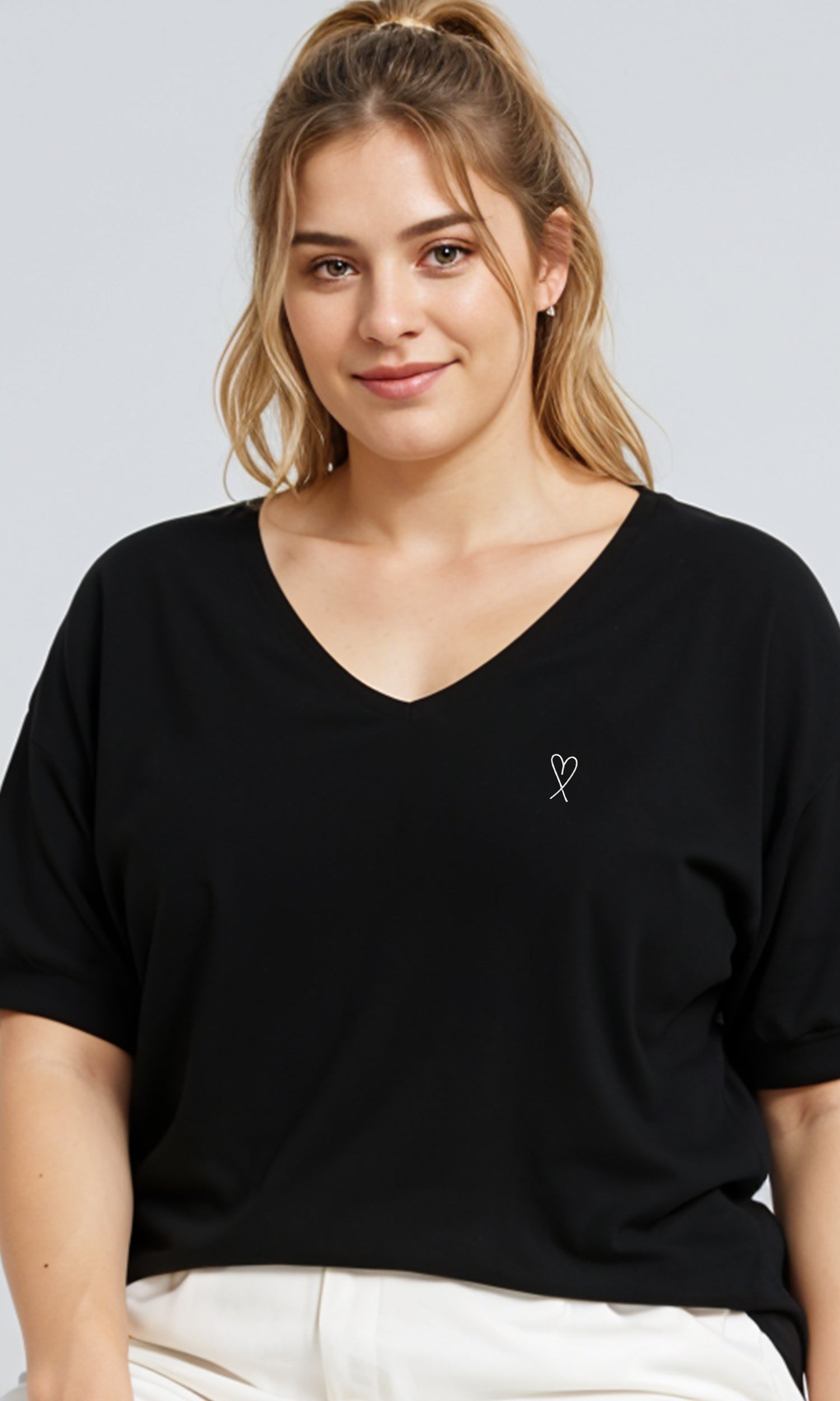 The relaxed V-neck flatters your neckline without showing too much, while the slightly loose fit gently skims over the tummy and arms for a confident, easy silhouette.