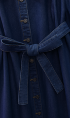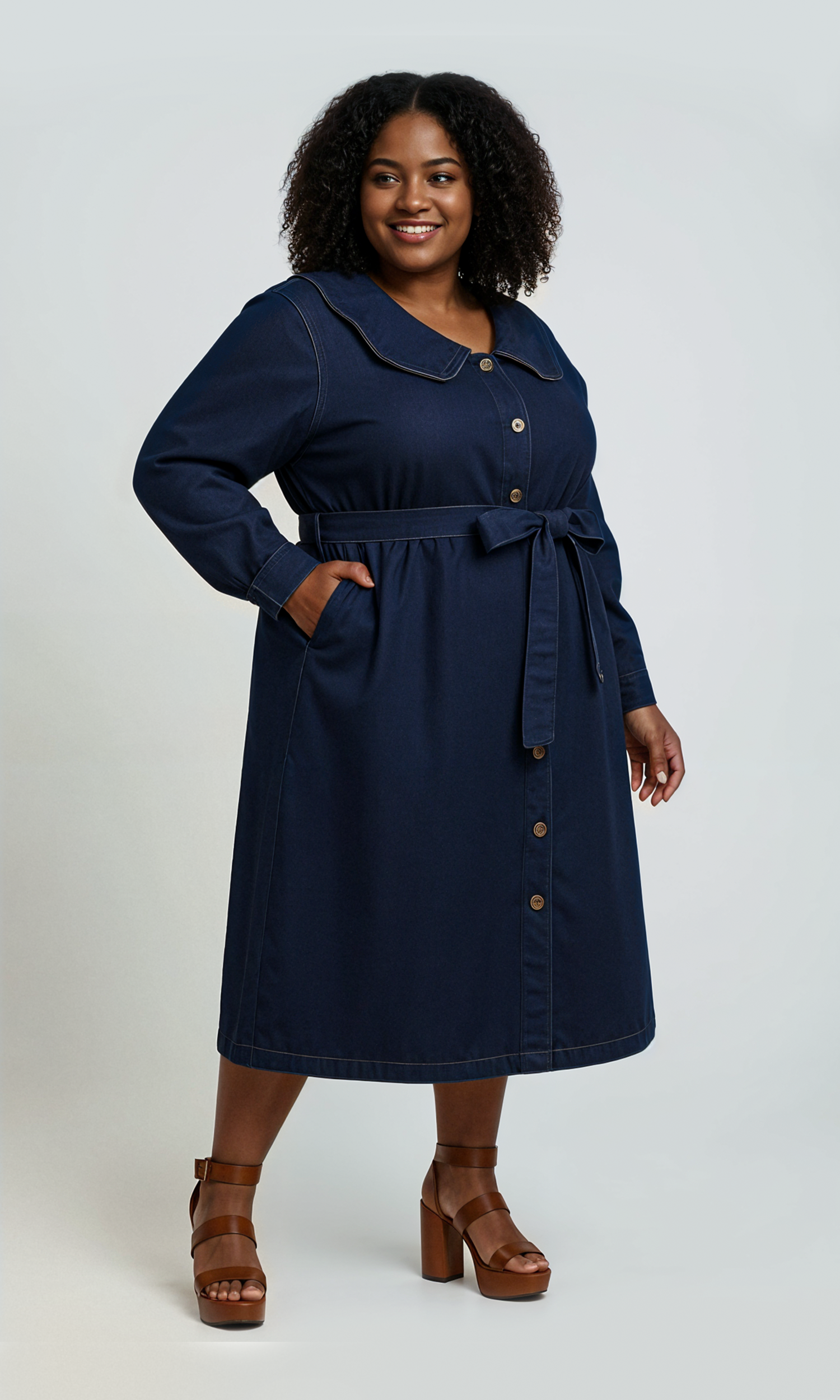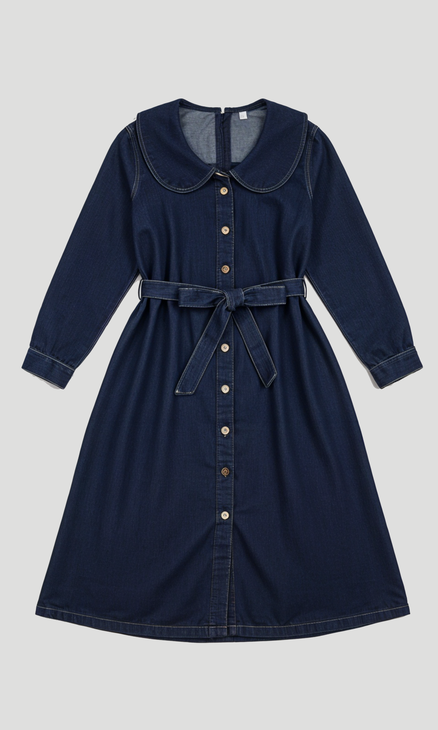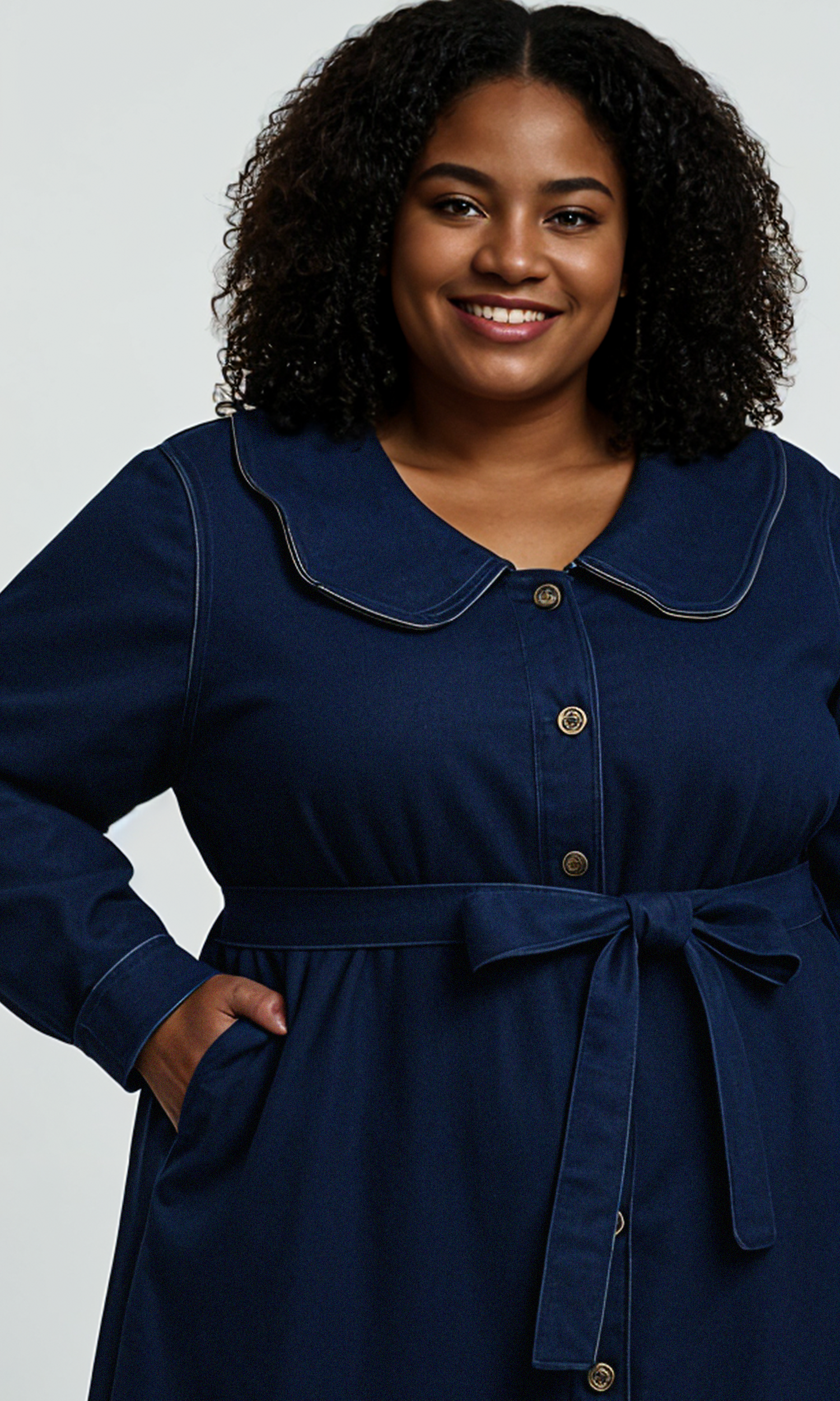 The Denim Grace Midi Dress brings timeless charm with its soft denim feel, delicate Peter Pan collar, and gentle waist tie that flatters without feeling tight.