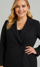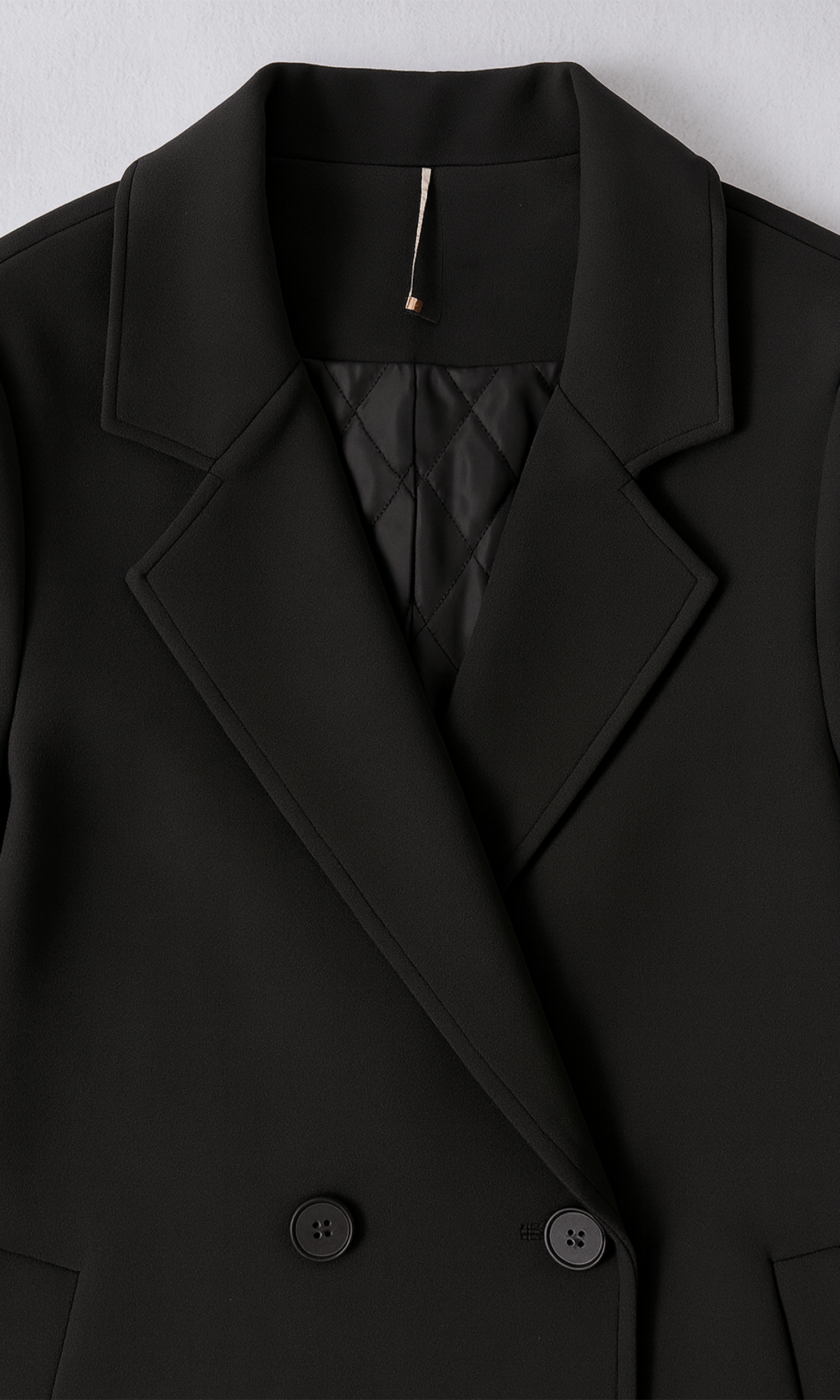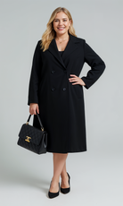 The double-breasted shape defines your waist while the long, clean lines elongate your frame, so you look confident and put-together, even on busy days.