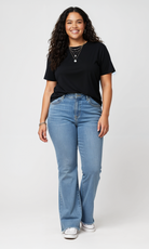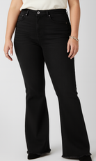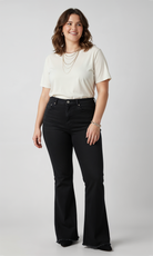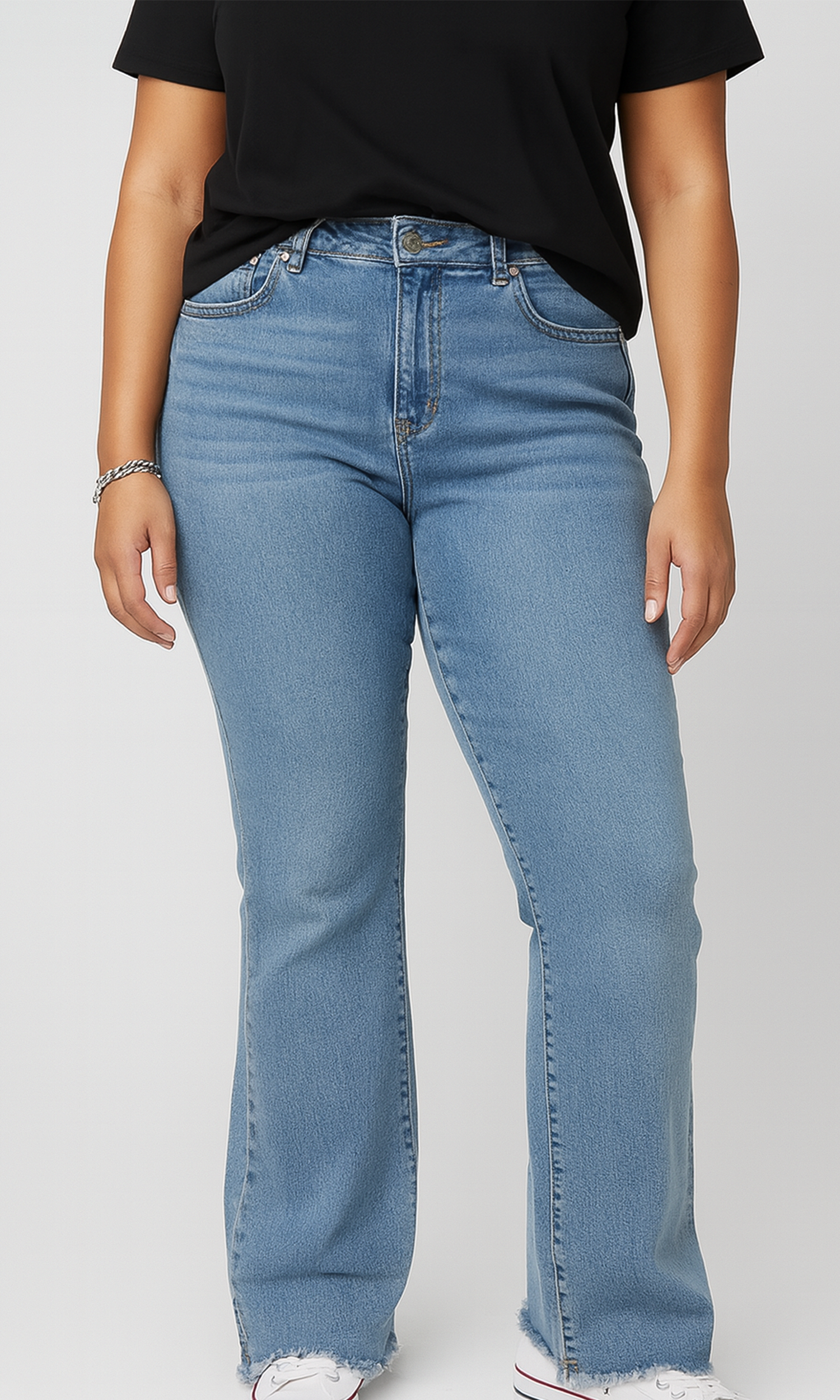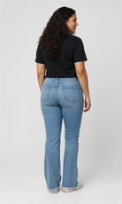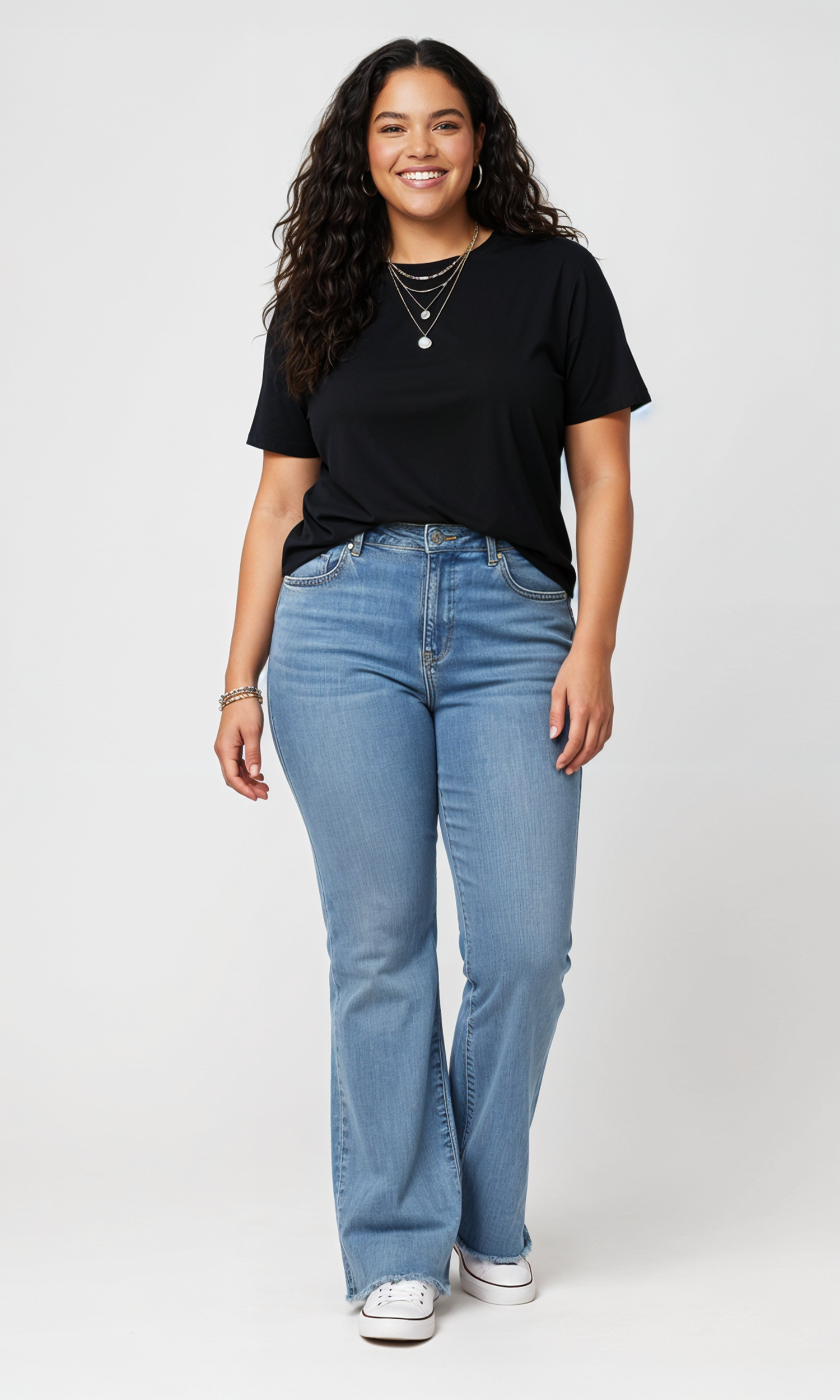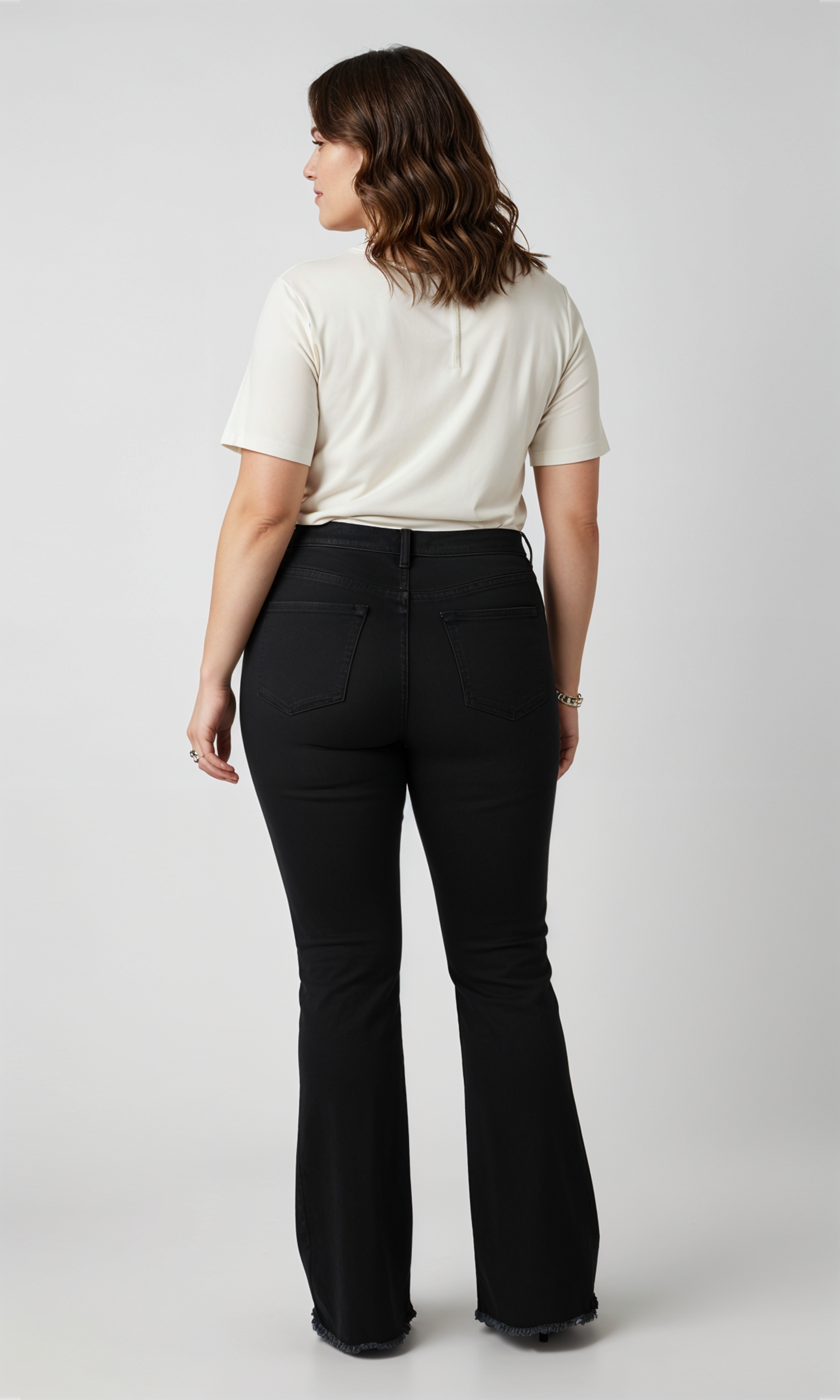 These jeans shape gently around your curves without ever feeling tight. The high-stretch denim moves with your body, giving you freedom at the tummy, hips, and thighs while keeping a sleek, confident silhouette. The high waist provides light support where you want it most, and the flared leg balances your shape beautifully from every angle.