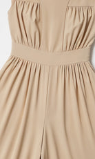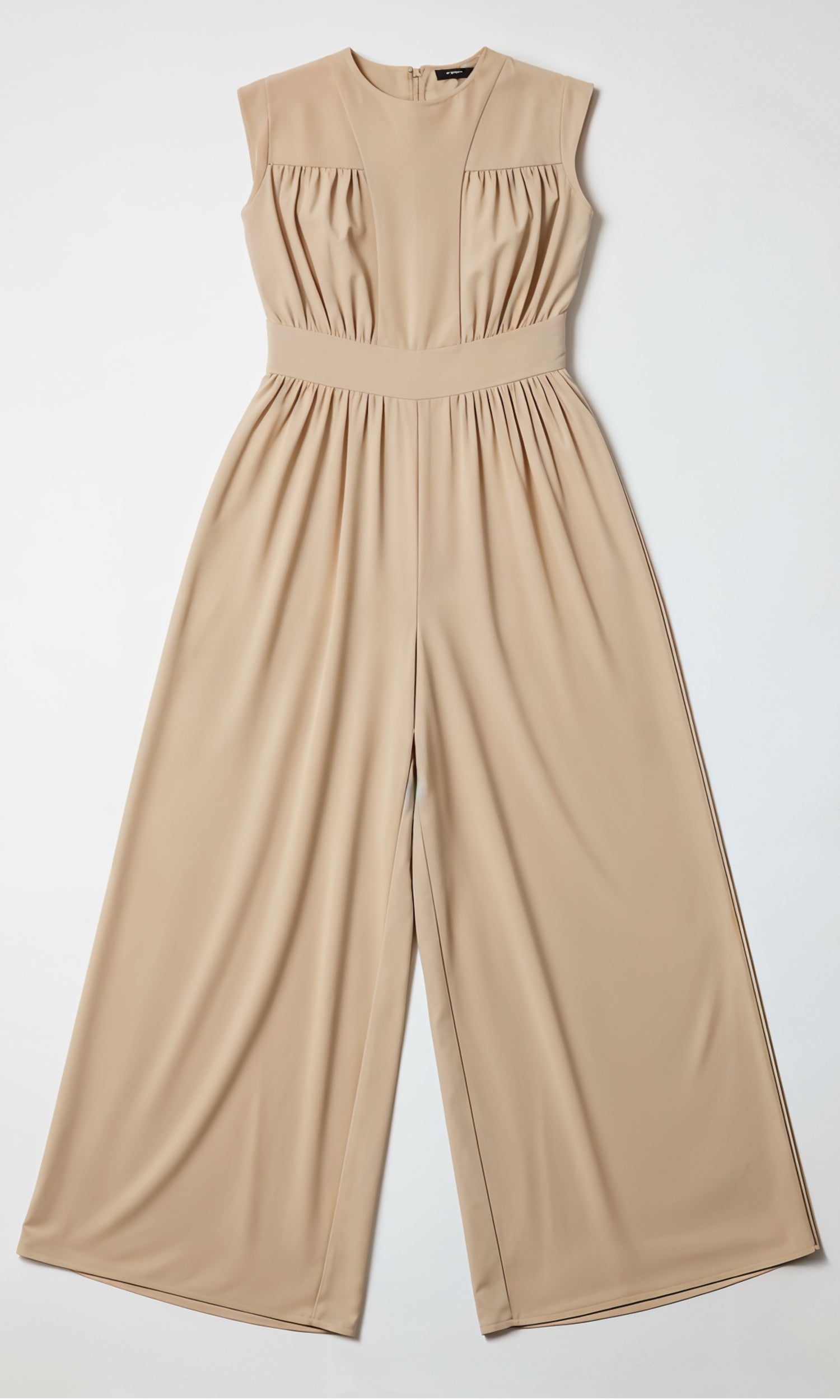 The wide-leg silhouette and softly gathered bodice create a balanced, elegant shape that feels both comfortable and refined.
