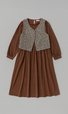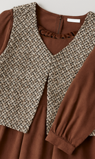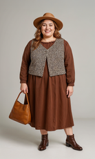 This soft brown midi dress with a textured tweed vest brings warmth, comfort, and timeless charm together in one easy outfit.